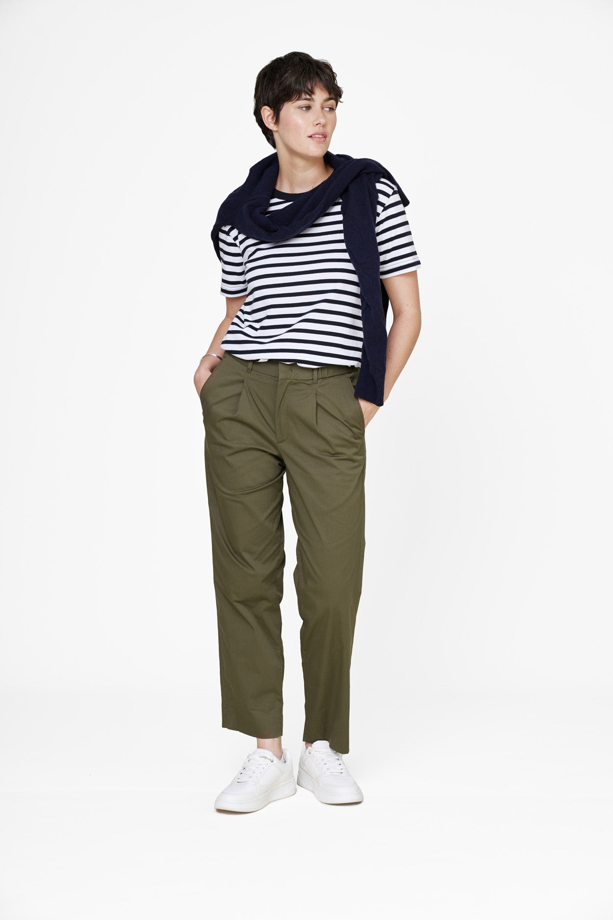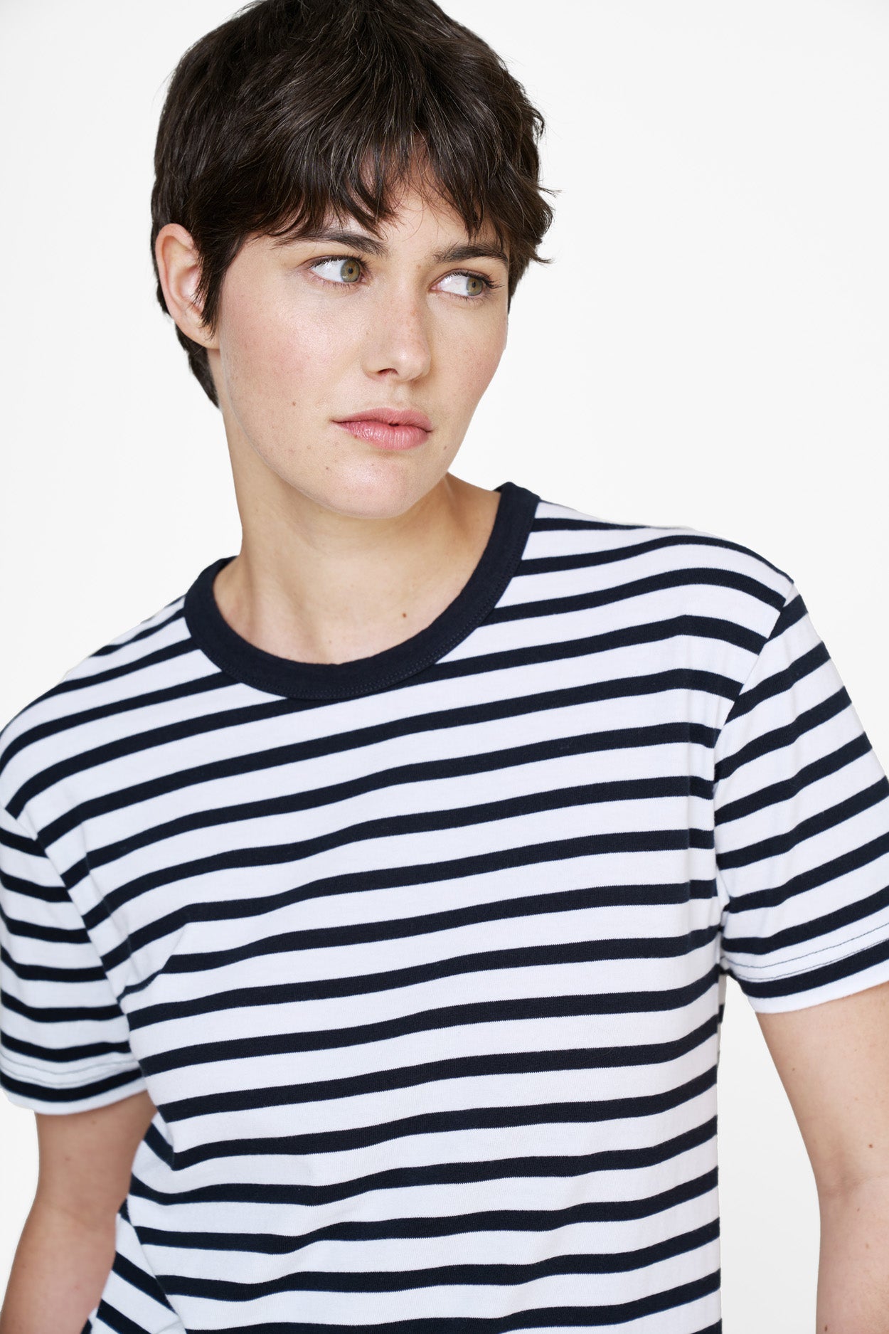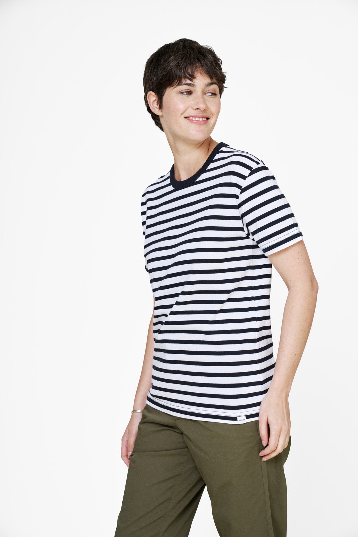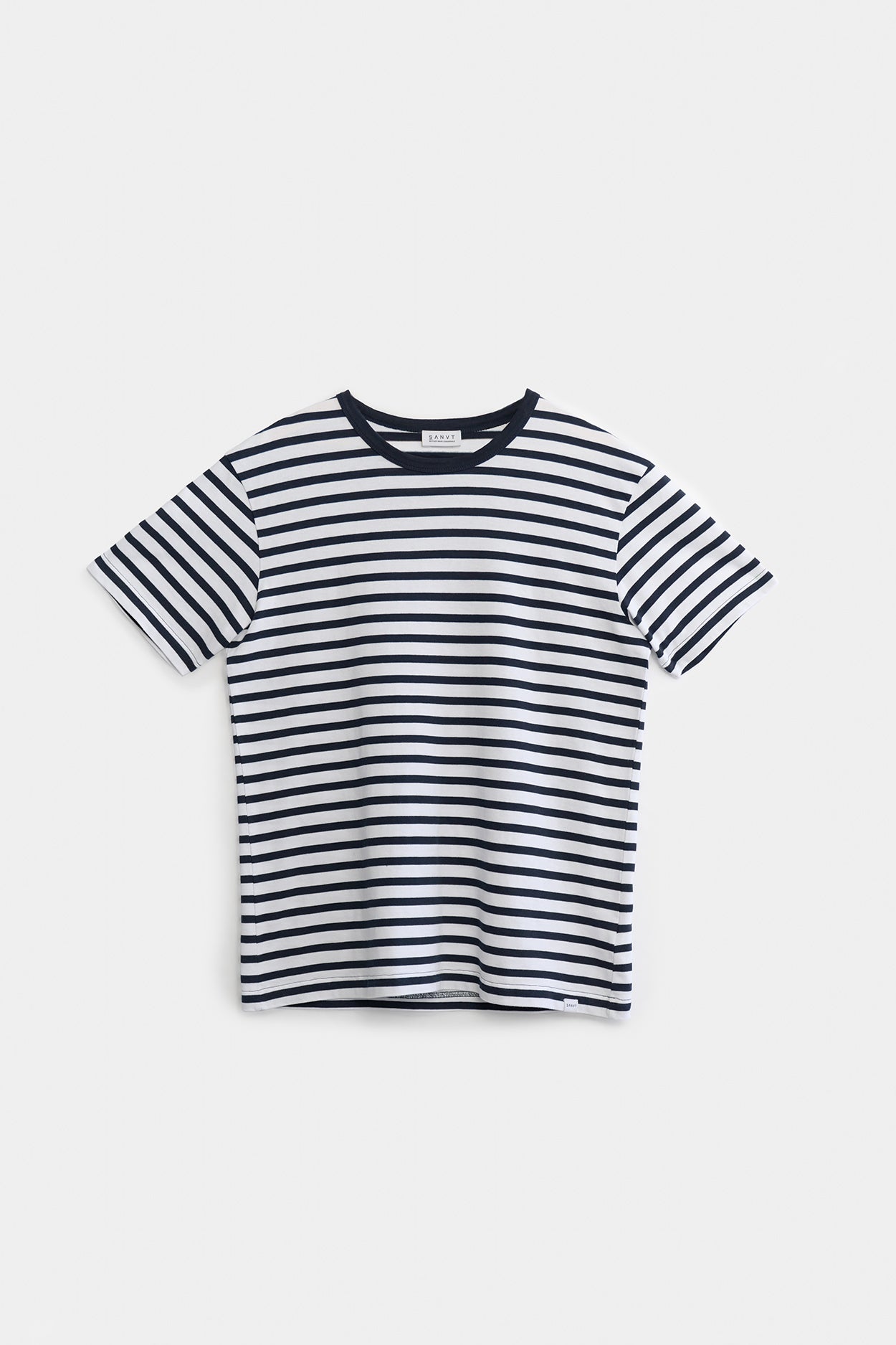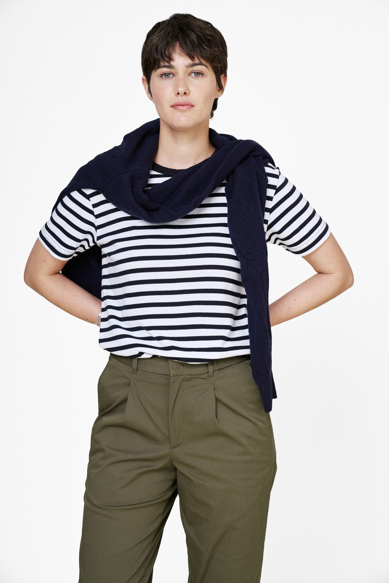 Der Stoff ist von dem traditionellen französischen Fischerhemd im maritimen Stil inspiriert. Die marineblauen und weißen bretonischen Streifen sind eine zeitlose Ergänzung für eine minimalistische Garderobe.