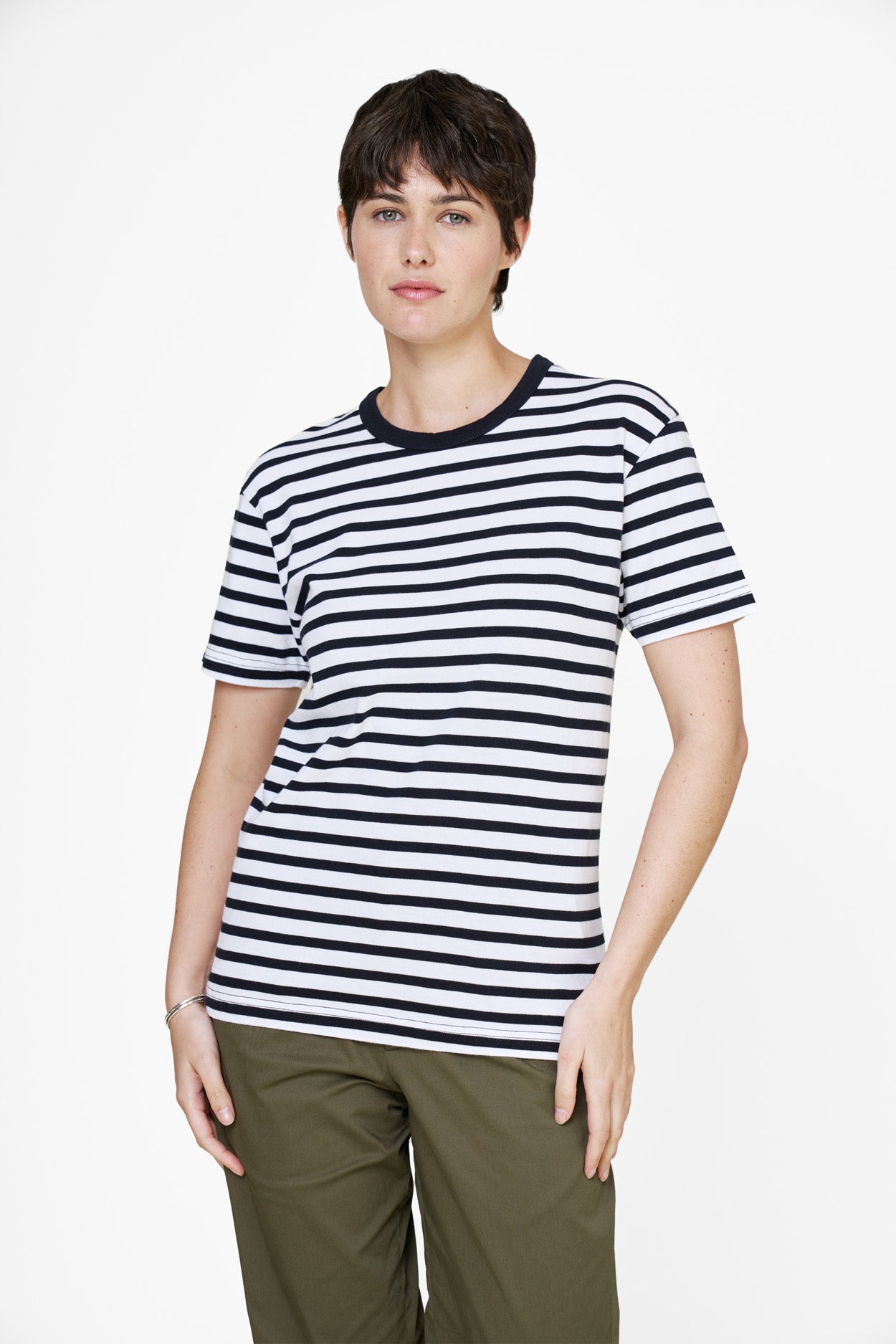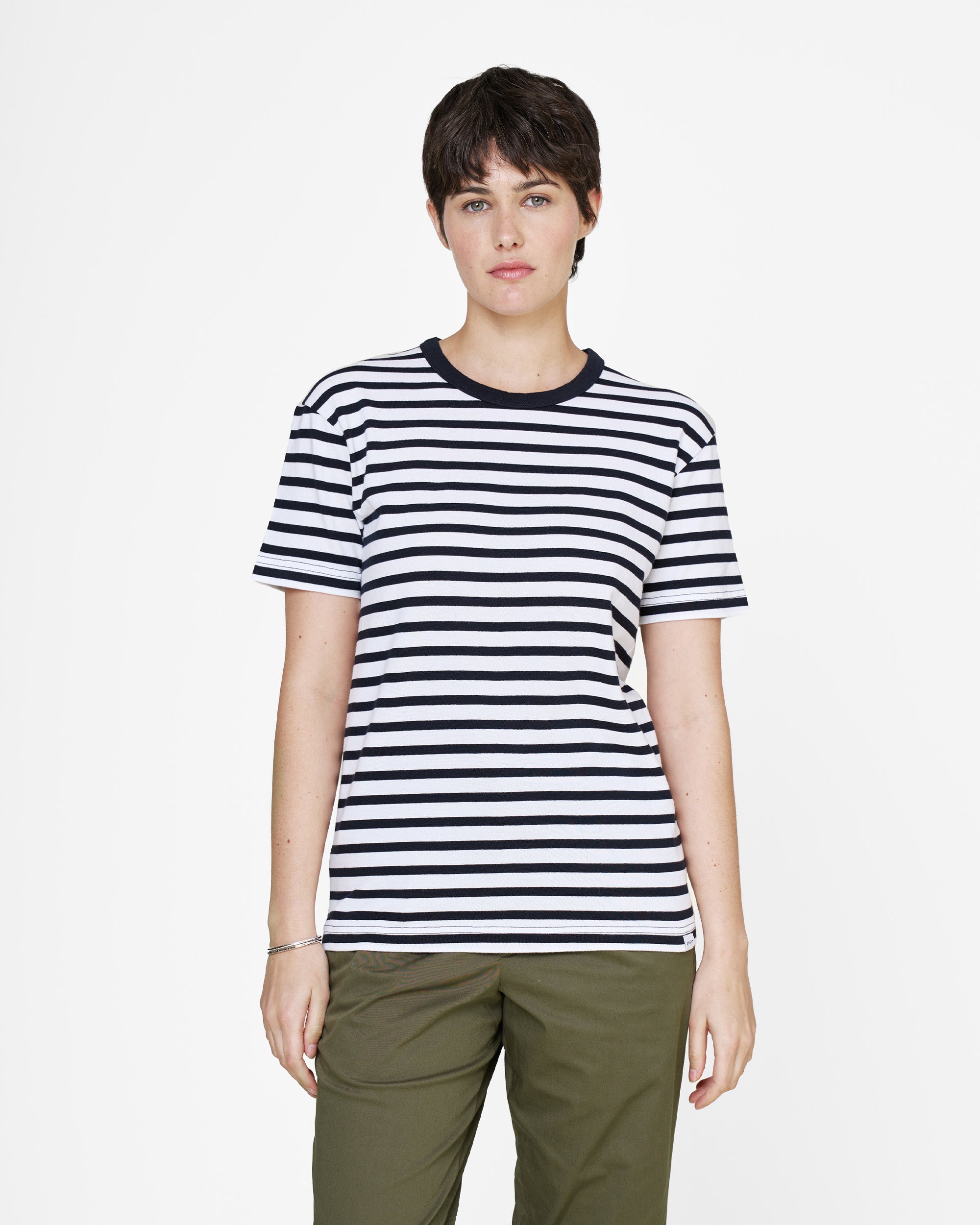 Unser 235 GSM Jersey verfügt über eine innovative Strickstruktur, die trotz des zusätzlichen Gewichts die Atmungsaktivität steigert. Das gestreifte T-Shirt hält dich also warm, ohne dich ins Schwitzen zu bringen.