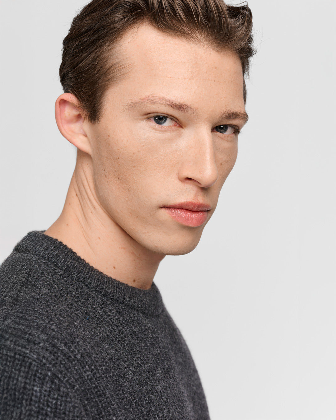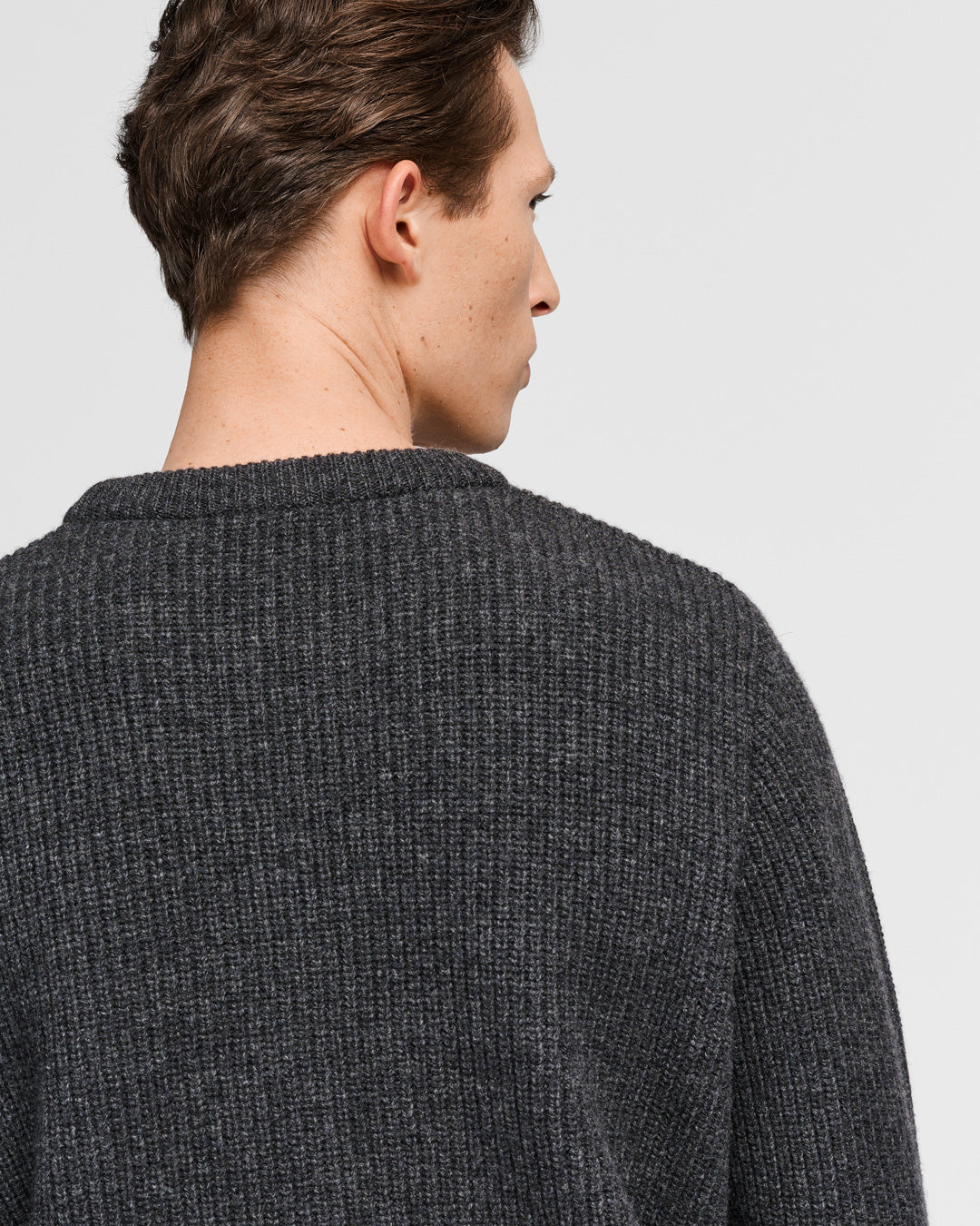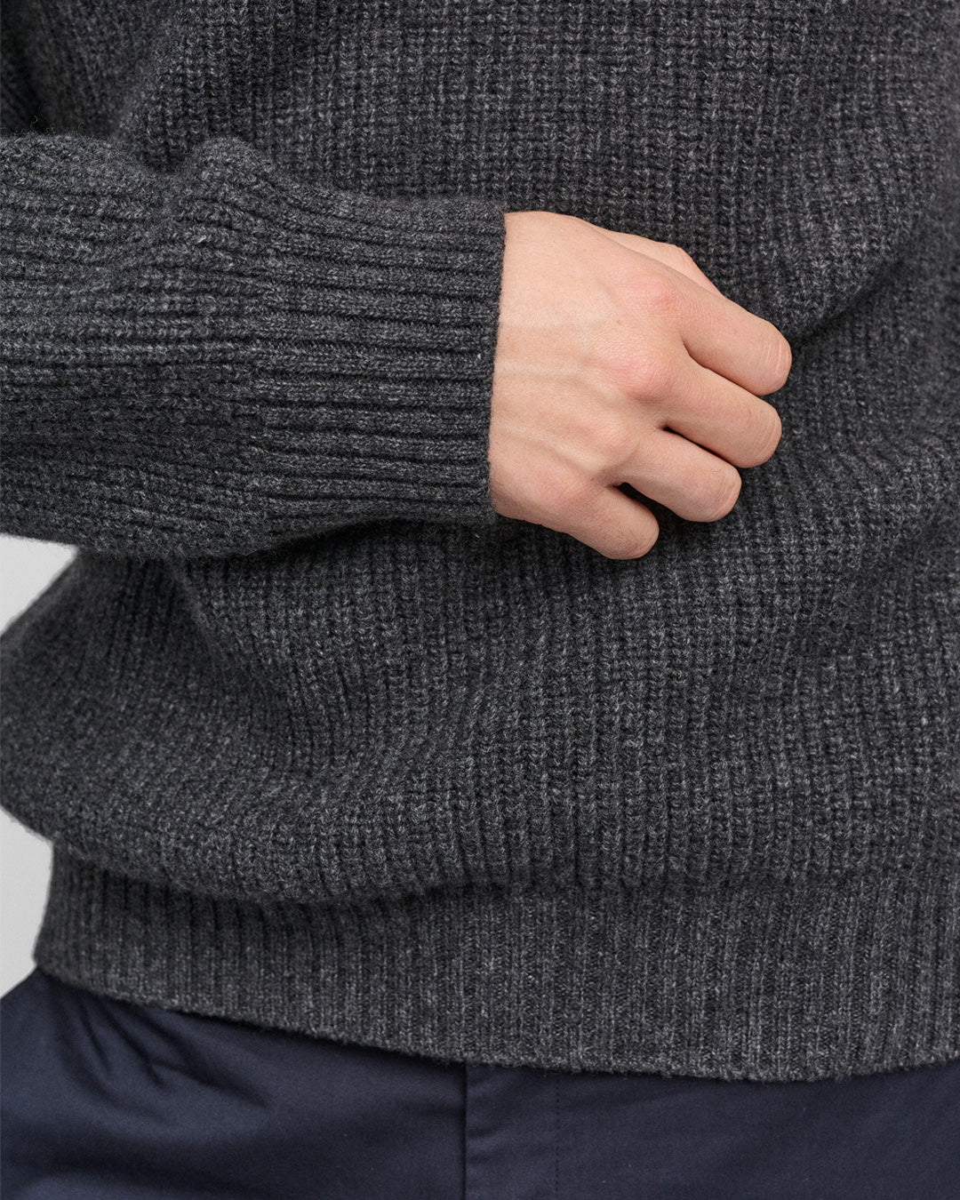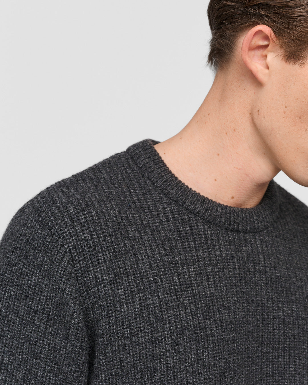 The hem and cuffs are finished with a fine 2x1 rib knit that holds its shape through wear and washing. This technique keeps the sleeves and waistband comfortably snug and structured, maintaining the sweater’s refined fit and polished look over time.