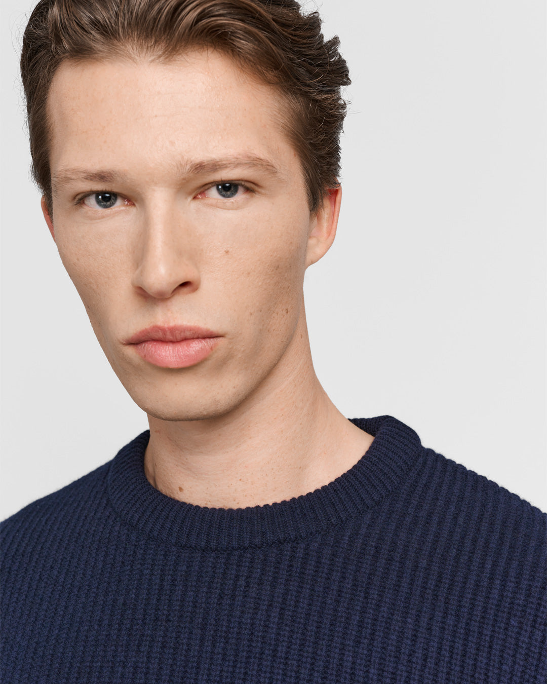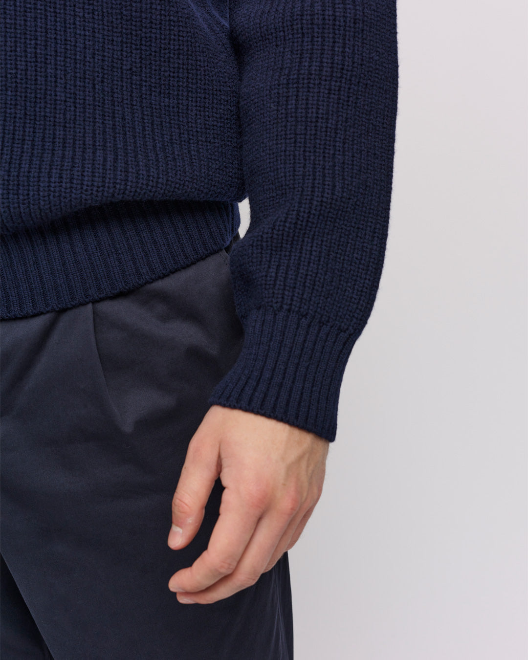 The hem and cuffs are finished with a fine 2x1 rib knit that holds its shape through wear and washing. This technique keeps the sleeves and waistband comfortably snug and structured, maintaining the sweater’s refined fit and polished look over time.